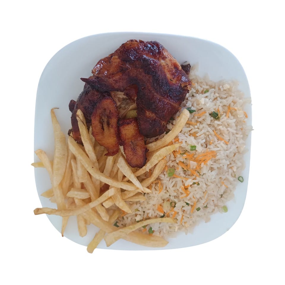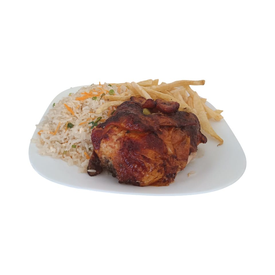 Este no es un cuarto cualquiera. Ofrecemos una porción más grande y jugosa de pollo a la brasa, cocinado lentamente para una carne tierna y llena de sabor. Acompañado de nuestro arroz especial con verduras (cebolla verde y zanahoria), que aporta frescura y color, y de dos porciones de plátano frito para un balance dulce perfecto. Junto a las papas fritas, creamos un plato abundante y sofisticado en su simplicidad. Ideal para un almuerzo reconfortante o una cena especial, donde la calidad y la presentación se notan en cada detalle.