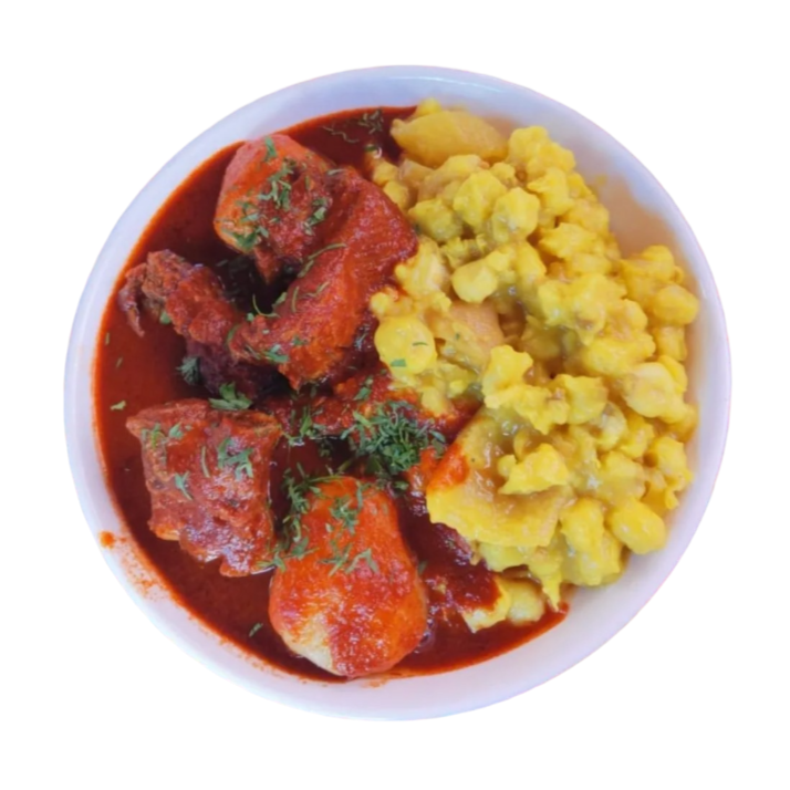 El Mondongo Chuquisaqueño de Las Brasa Sucre es un plato típico tradicional preparado con respeto a la gastronomía de Chuquisaca. Incluye un exquisito chicharrón de cerdo, crujiente por fuera y jugoso por dentro, cubierto con un ají rojo espeso y lleno de sabor, elaborado con receta tradicional. Se acompaña con papa imilla bien cocida y un delicioso mote pelado, que equilibran perfectamente el plato. Como toque final, se añade cuerillo cocido y adornado con perejil finamente picado, resaltando su presentación y sabor. Es un plato ideal para quienes buscan disfrutar de la auténtica comida chuquisaqueña en una porción completa y bien servida.